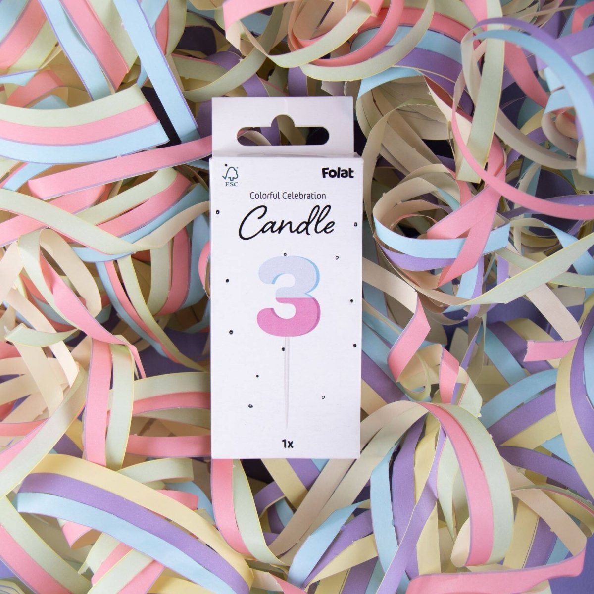 Som en festmåltid på tårtan! Ljus - Stripetastic - Nummer 3. Innehåll: 1 nummerljus. Används t.ex. under följande fest/festtillfällen: Födelsedag, Barnkalas, Jubileum. Detta ljus är format som siffran "3". Toppen är ljusblå och botten är lilarosa. Ljuset är ca 5 cm högt och 8 mm tjockt. Ljusets totala längd (inklusive stickan, exklusive veken) är ca 9 cm. Denna artikel är tillverkad av vax.