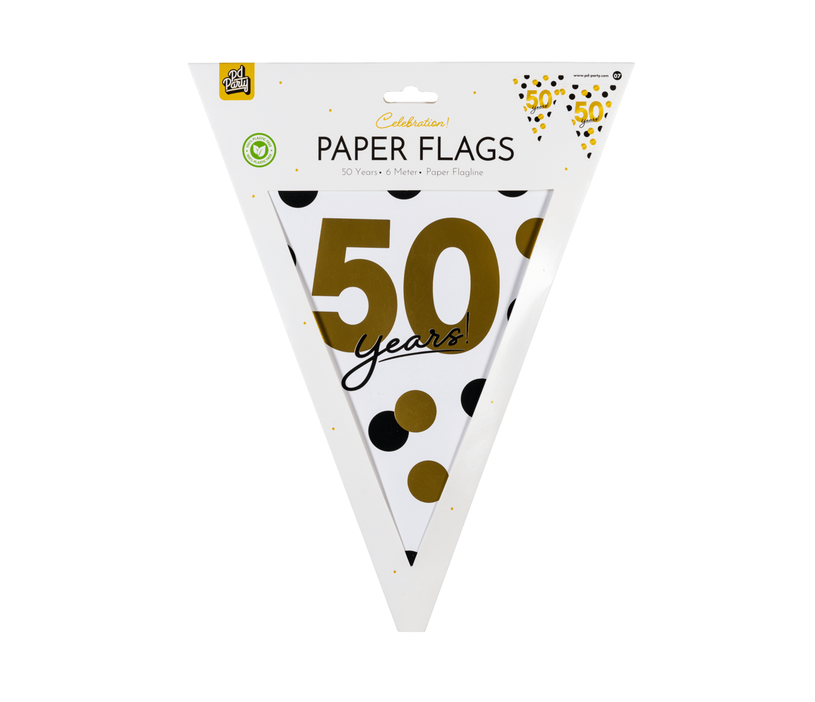 Pappersflaggorna Celebration! pappersflaggor - 50 är de perfekta flaggorna för att lysa upp en fest för en 50-åring! Denna flagglinje sticker ut med sin distinkta design och eftersom flaggorna är tillverkade av papper tänker du också på miljön! Pappersflaggorna är 6 meter långa. Kombinera dem med de matchande celebration! ballonger!
