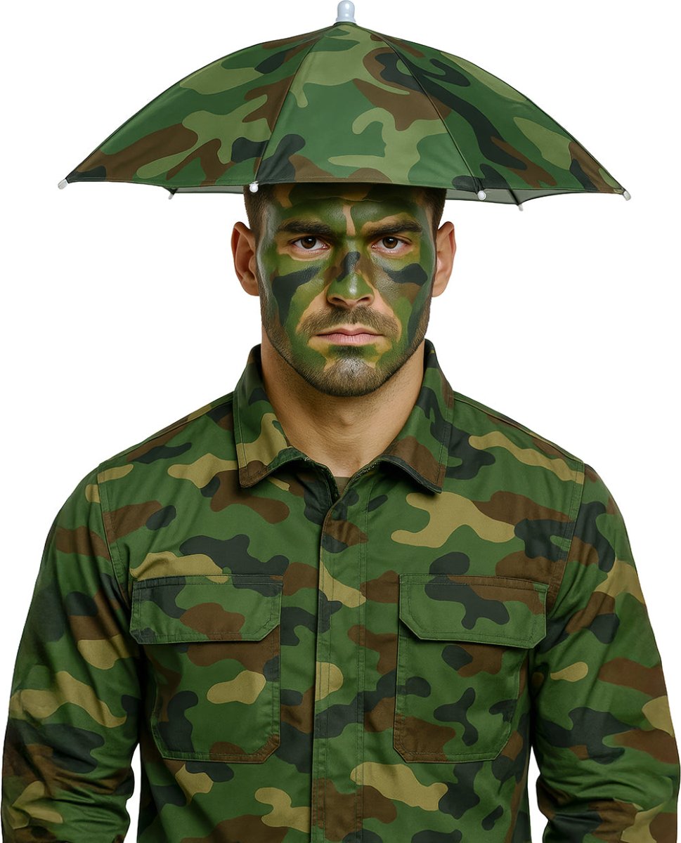 Håll huvudet torrt med detta praktiska militärparaply. Det justerbara pannbandet gör det enkelt att bära paraplyet utan att använda händerna, perfekt för utomhusaktiviteter, festivaler eller temafester. Det gröna kamouflageutseendet gör det till ett roligt och funktionellt tillbehör för vuxna.