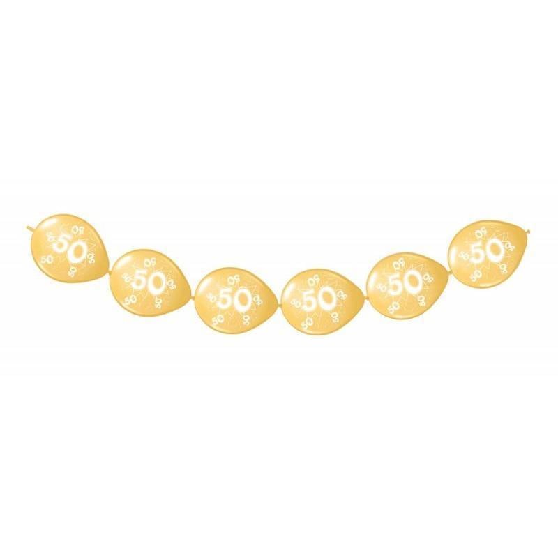 50 års jubileum knappballonger - 3 meter. Innehåll: 8 latexballonger. Kan t.ex. användas under följande fest/festtillfällen: jubileum, födelsedag. Girlangen är 3 meter lång och de 8 ballongerna är 10 tum/25 cm. Artikeln är tillverkad av latex.