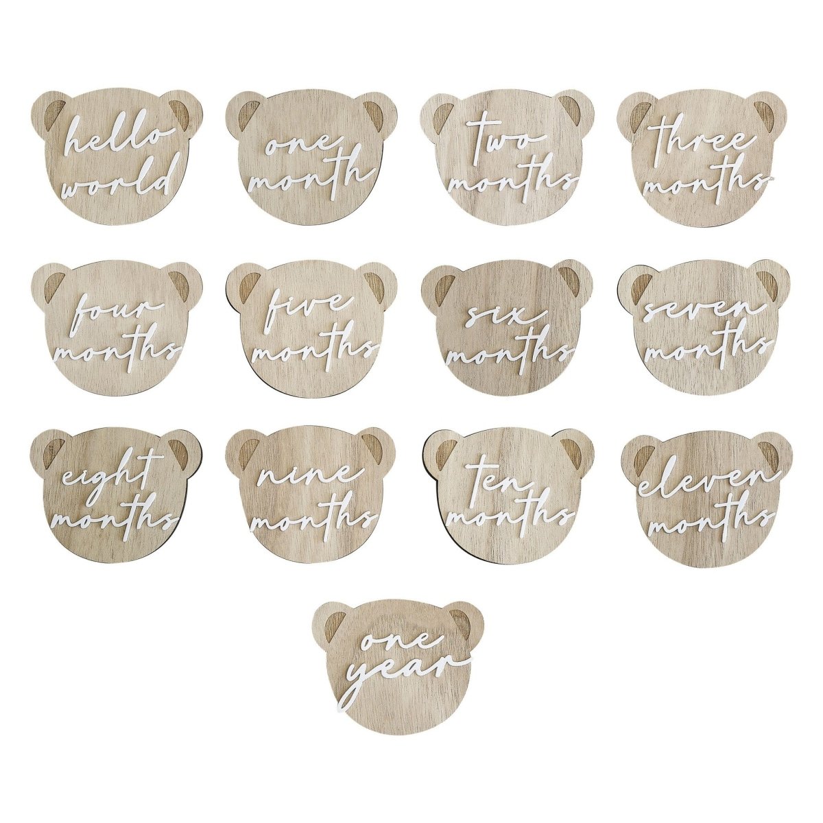 Varje förpackning innehåller 13 milstolpsskyltar i trä i form av en nallebjörn med vita akrylbokstäver, var och en 8,1 cm (H) x 10 cm (B) och består av:
