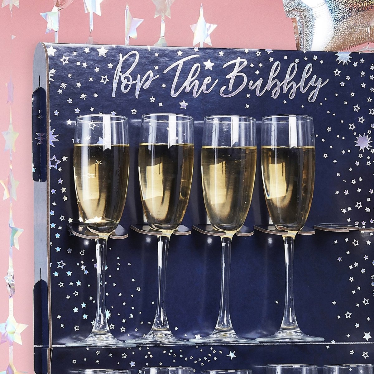 Placera vår Prosecco Wall i mitten av ditt bord för en visning som dina gäster aldrig kommer att glömma. Dryckesväggen har iriserande folierad Pop The Bubbly-text som är den perfekta pricken över i:et för en fantastisk festuppsättning. Varje förpackning innehåller 1 prosecco väggställ med 2 stativ.