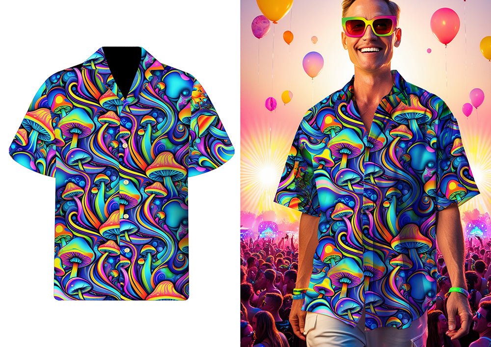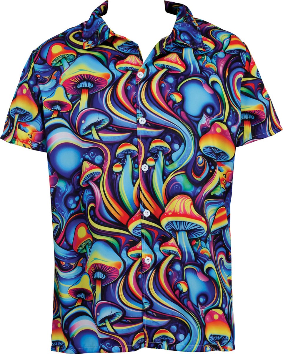 Stick ut med denna livfulla Psychedelic Shrooms-blus i blått, grönt och orange. De slående färgerna och det unika mönstret ger skjortan en riktig retrolook, perfekt för temafester, festivaler och karnevaler. Tillverkad av lätt och smidig polyester för optimal komfort och rörelsefrihet.