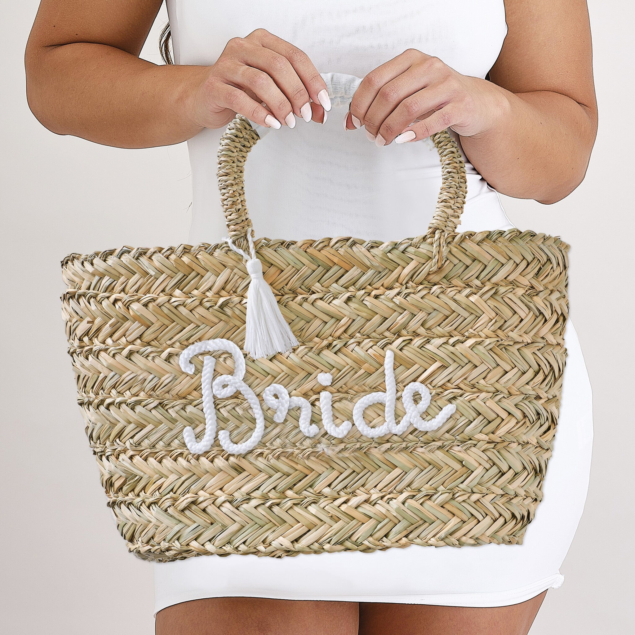 Varje vävd "Bride"-väska har repbokstäver och vita tofsar.