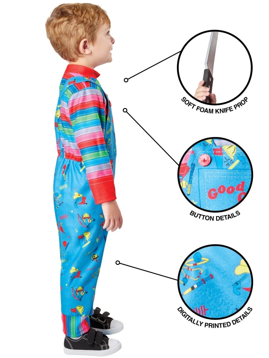 Denna officiellt licensierade Chucky dräkt för småbarn förvandlar ditt barn till en miniversion av den ikoniska karaktären från kultklassikern. Dräkten är inspirerad av den berömda "Good Guy"-dräkten och kommer garanterat att göra ett iögonfallande intryck på temafester, maskerader eller Halloween.