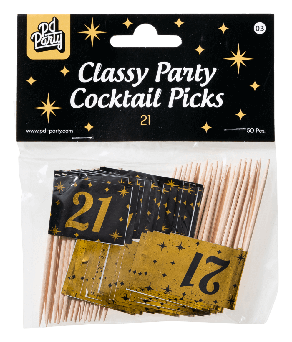 Beskrivning Recensioner Om denna produkt Antal: 50 stLängd: 6,5cmBredd: 3cmHöjd: 0,1cmFärg: guld svartVikt: 18 gramMaterial: papper/träPaper DreamsCocktailplockarna Classy party är den perfekta dekorationen för ett mellanmål på t.ex. en födelsedag. Färgen svartguld och den "classy" designen gör att dessa cocktailplockare sticker ut! Trustpilot