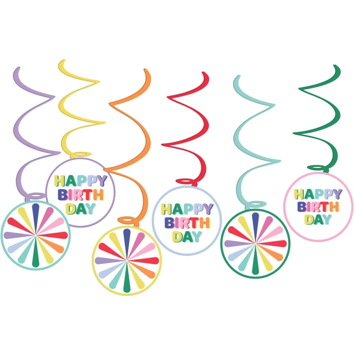 Den här festen är alltid i rörelse. Hängande dekoration - Stripetastic - 6 stycken. Innehåll: 6 stycken hängande dekorationer. Används t.ex. under följande fest/festtillfällen: Barnkalas, Temakalas, Festival. 6 st. hängande dekorationer: 3 cirklar med färgade ränder, alla i olika mönster och 3 cirklar med texten "HAPPY BIRTH DAY". Alla på olikfärgade girlanger. Dekorationerna är ca 13 cm breda, 60 cm långa (hängande) och lätta att hänga upp med hjälp av snörets ögla (+/- 7 cm lång). Tryckt på båda sidor. Passar till födelsedagar och fester året runt. Denna dekorationsuppsättning tillhör vår Stripetastic-kollektion av Folat. Denna artikel är tillverkad av papper.