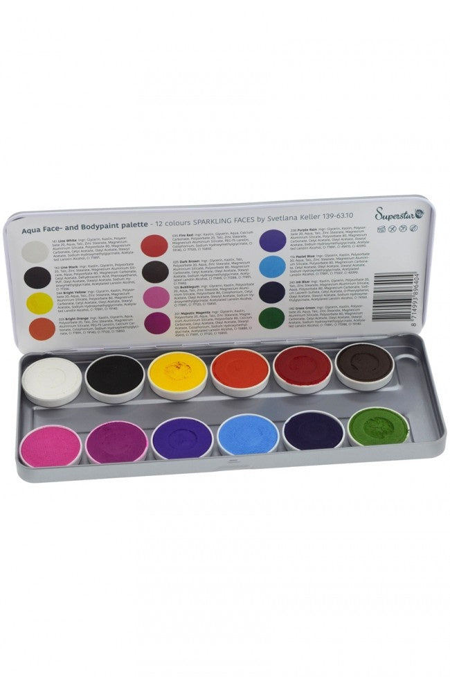 Svetlana Kellers Superstar Sparkling Faces sminkpalett innehåller 12 färger vattensmink av hög kvalitet som uppfyller de stränga kraven i den europeiska kosmetikalagstiftningen (1223/2009/EG).