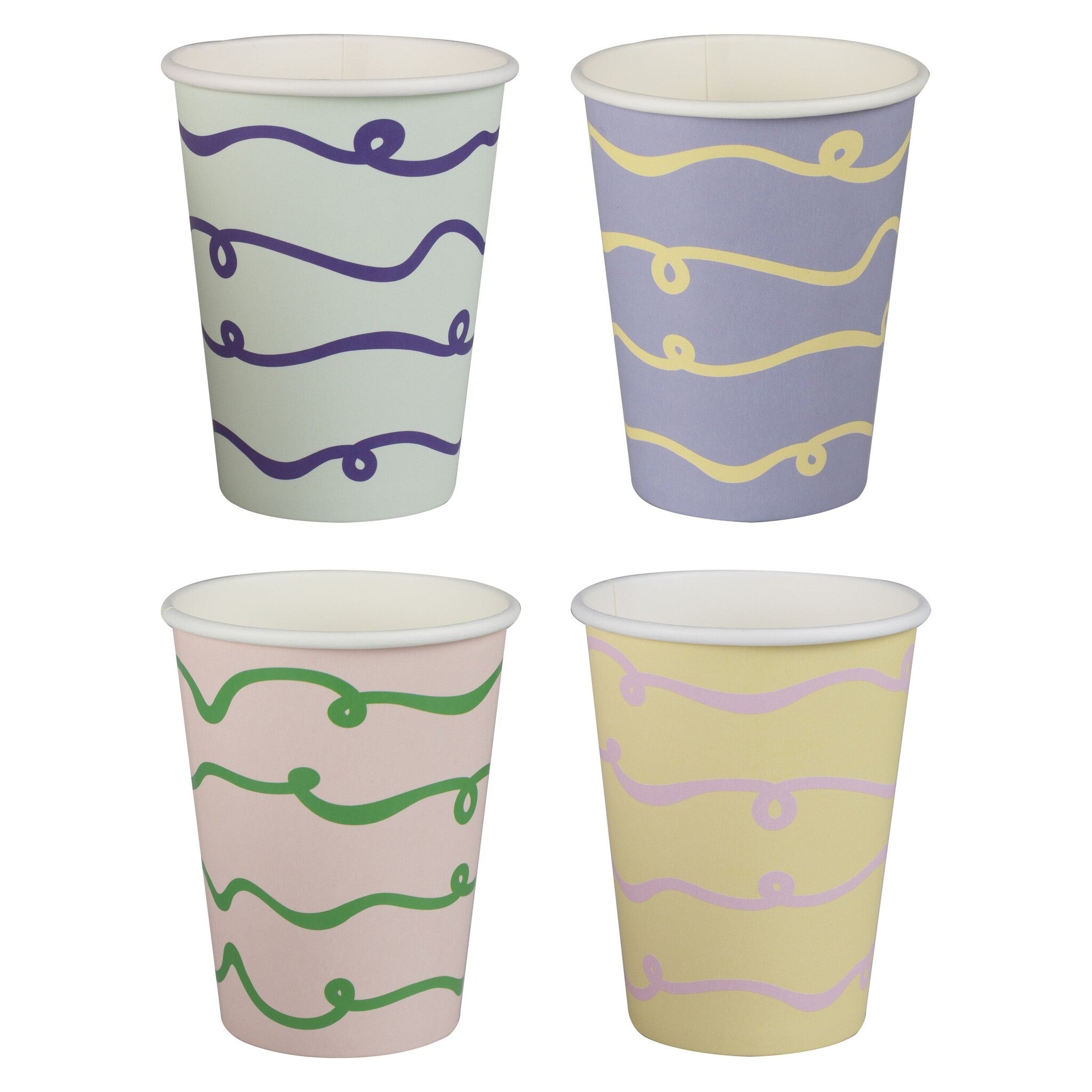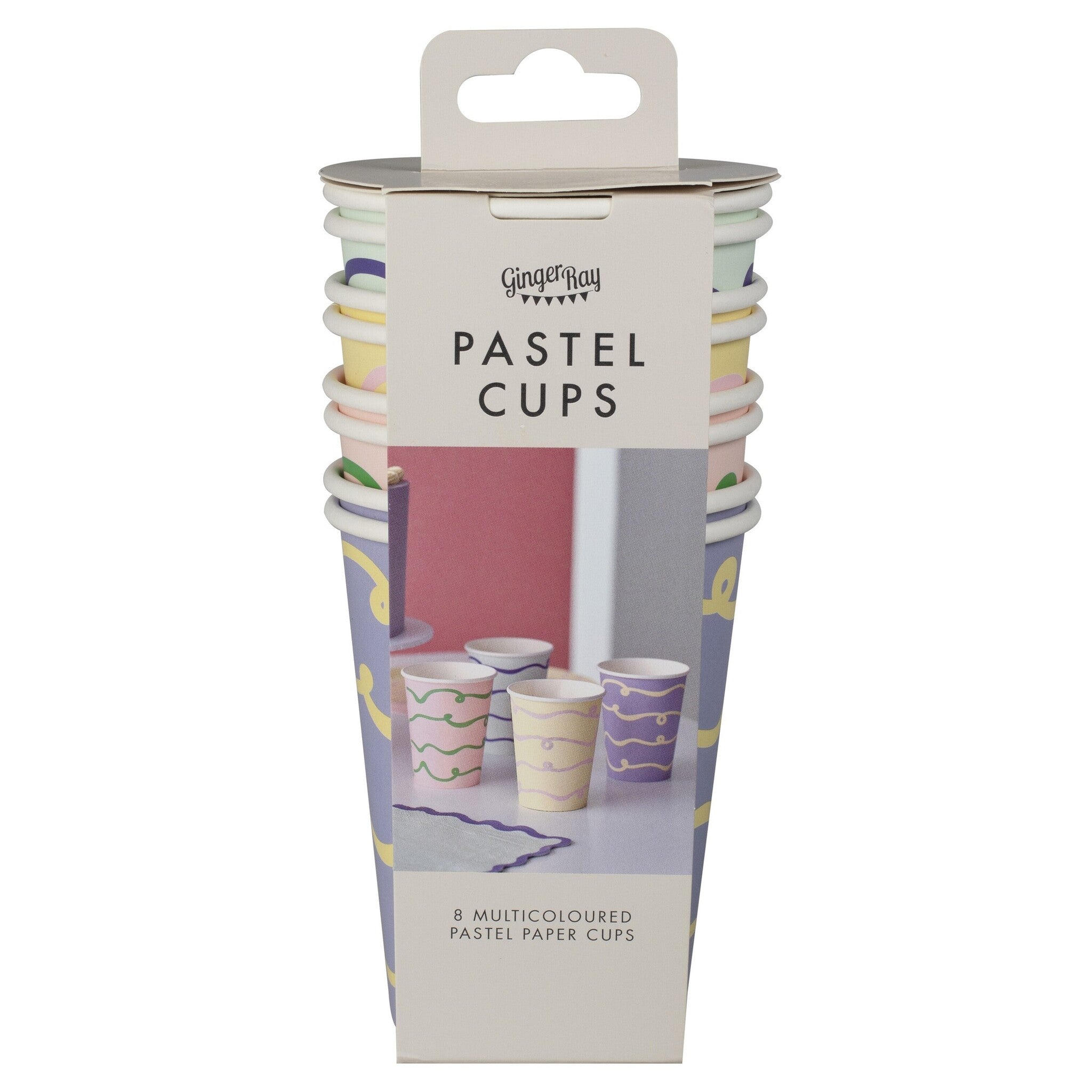Innehåller 8 pastellfärgade pappersmuggar i lila, gult, grönt och rosa.