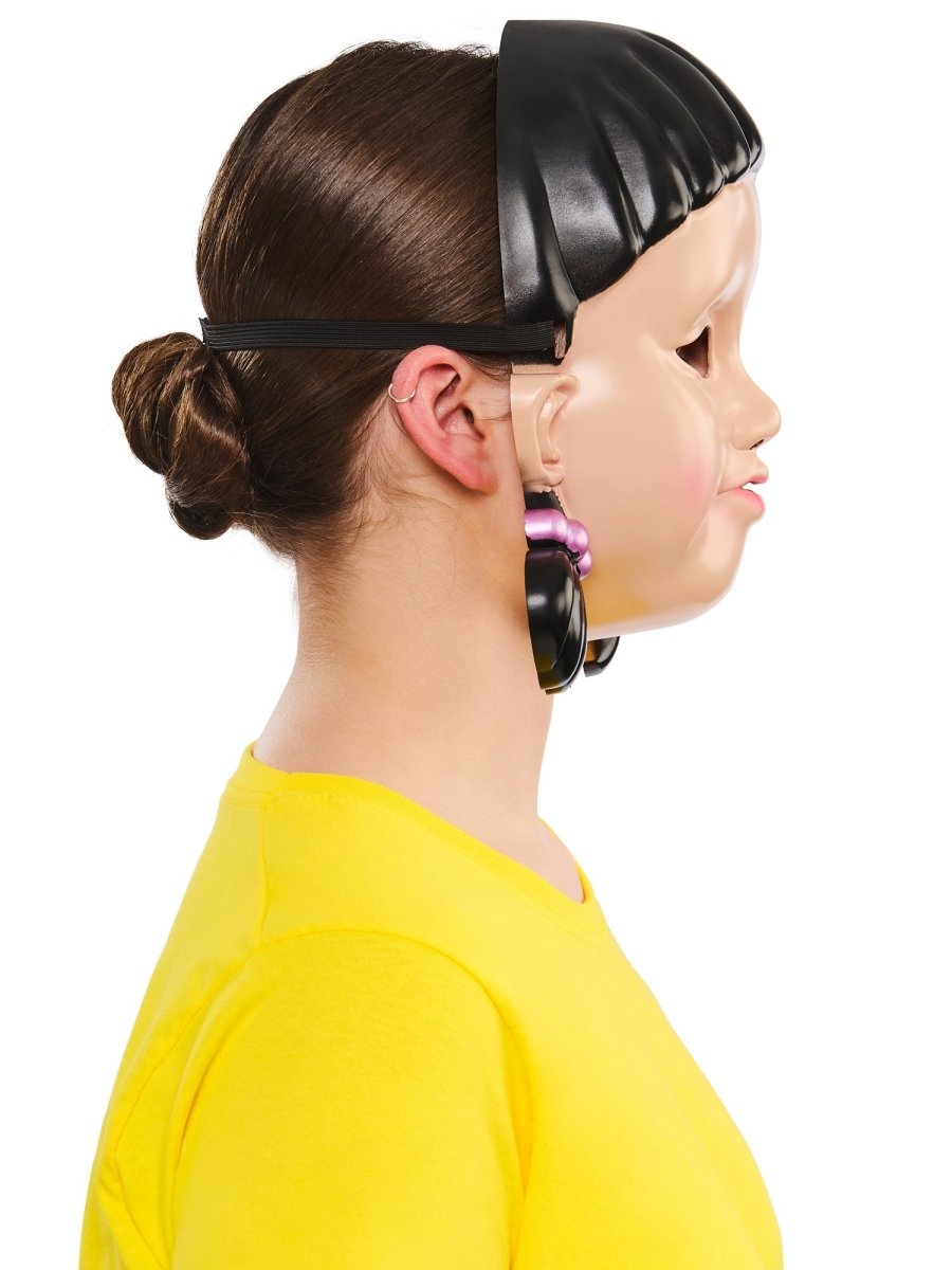 Förvandla dig till den läskiga och mystiska karaktären av den ikoniska Girl Doll från Squid Game med denna noggrant formade halvmask. Perfekt att kombinera med en dräkt för en komplett Halloween-look.