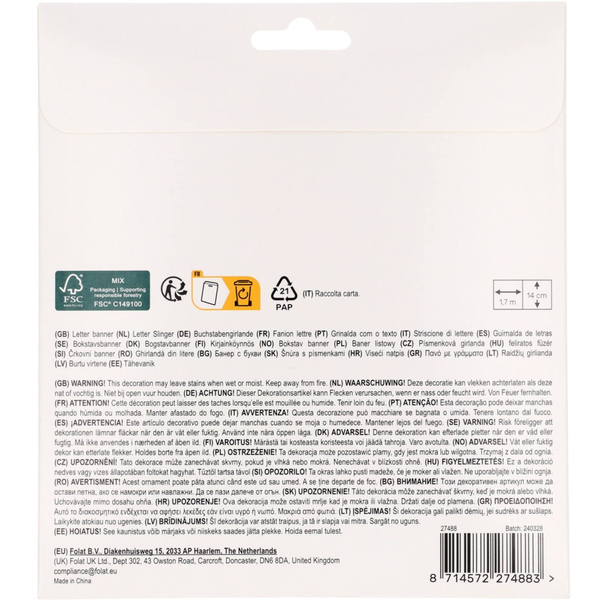 Hoop Hurra för prinsessan! Letterslinger Set - Pretty Princess - 1,5 meter. Innehåll: 1 bokstavsgirlang i 2 delar. Kan t.ex. användas under följande kalas/festtillfällen: Barnkalas, Födelsedag. Med äkta glänsande guld tack vare den använda varmstämplingstekniken. Girlanden består av två delar: en girlang med texten "HAPPY BIRTHDAY" (bokstäver ca 14 cm höga) med en gyllene krona och en rosa vagn på vardera sidan, och en girlang med den gyllene texten "Princess" (bokstäver ca 14 cm höga) med 2 prinsessor och ett rosa hjärta på vardera sidan. Tryckt på båda sidor. Alla delar kan skjutas fram och tillbaka över det rosa bandet. Banden på båda kransarna är 1,7 meter långa. Detta set med bokstavskransar tillhör Pretty Princess-kollektionen av Folat. Denna artikel är tillverkad av papper.