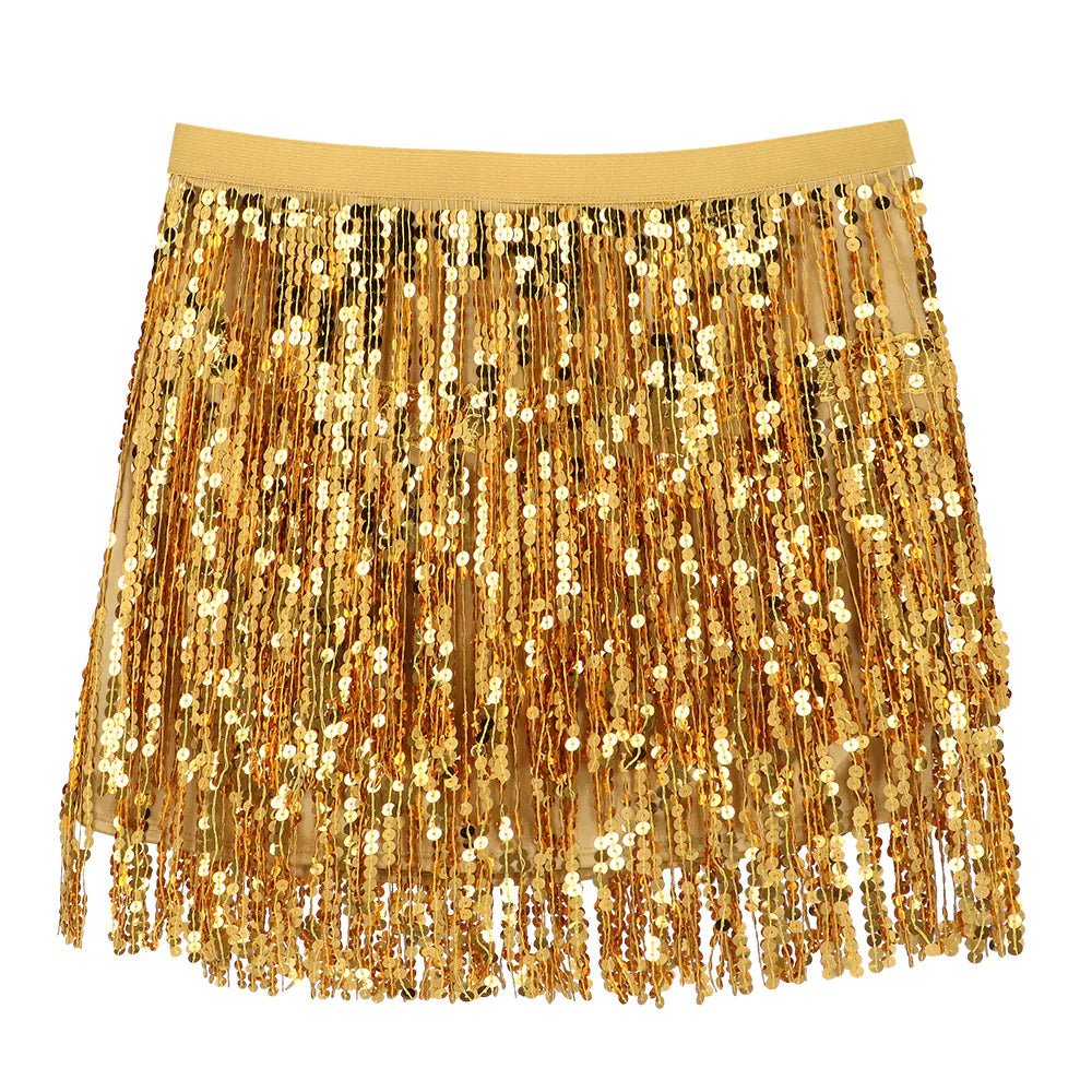 Låt dig själv skina med den här glittrande minikjolen i guld! Kjolen är dekorerad med skimrande paljetter och lekfulla volanger och rör sig med varje steg för en oemotståndlig effekt. Perfekt för fester, karnevaler eller maskerader.