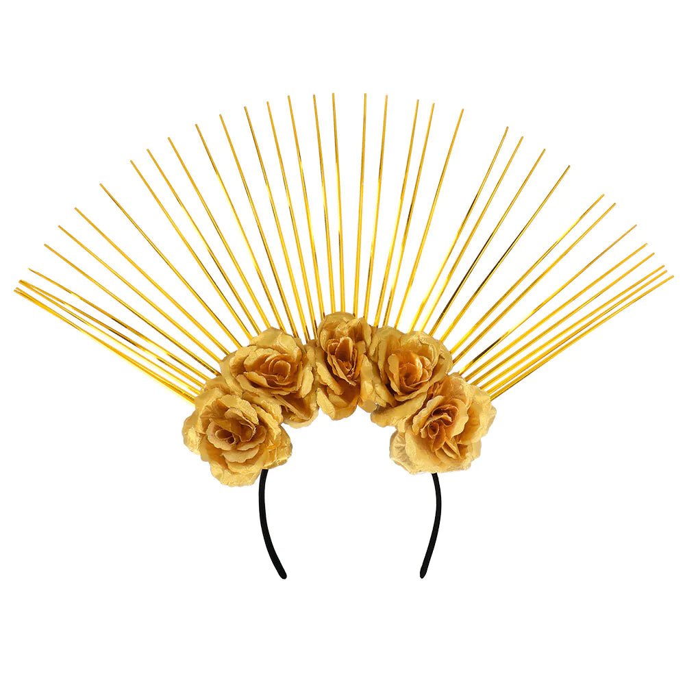 Den här vackra Nova halo crown är en unik tiara med stora guldblommor som får en festival- eller bröllopsoutfit att skina och ger looken en Boho touch. Dessutom är denna vackra halokrona diadem också en unik accessoar för att slutföra en kostym som en gudinna eller ängel för karneval eller ett cosplay-evenemang.
