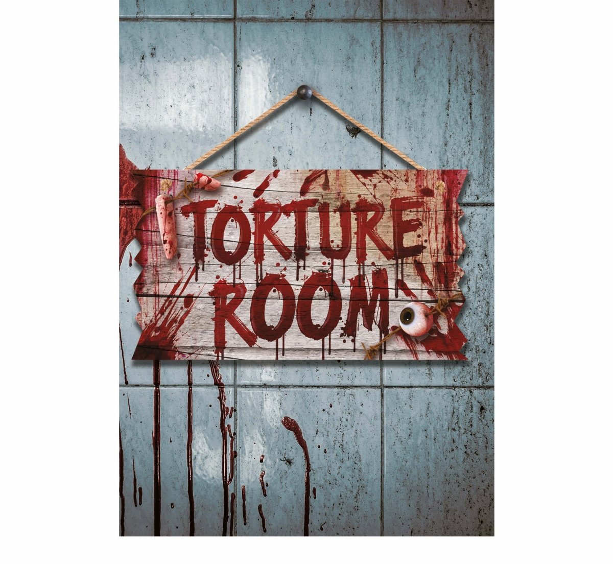 Ge din dörr en läskig look med denna 35 cm Halloween dörrskylt Torture Room. Perfekt att hänga upp under Halloween eller temafester och skapa omedelbart en spännande atmosfär.
