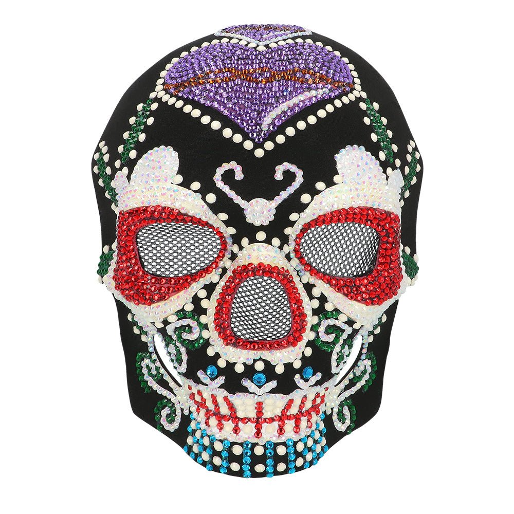 De detaljerade dekorationerna, de glänsande stenarna och de livfulla färgerna gör denna lyxiga mask till ett riktigt blickfång. Dödskalledesignen i kombination med de vackra färgerna gör masken perfekt för temat Day of the Dead. Ett snyggt tillägg till en Dia de los Muertos-outfit för Halloween, temafest eller bus eller godis.
