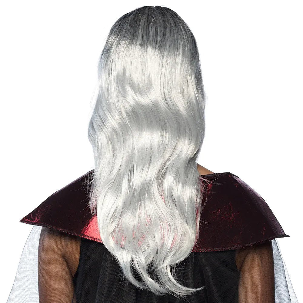 En vacker gothic peruk för kvinnor med långt lockigt hår och gardinfransar. Peruken har en vitgrå färg som ger den ett mörkt utseende och kan därför användas perfekt som komplement till en läskig och sexig vampyrdräkt till Halloween.