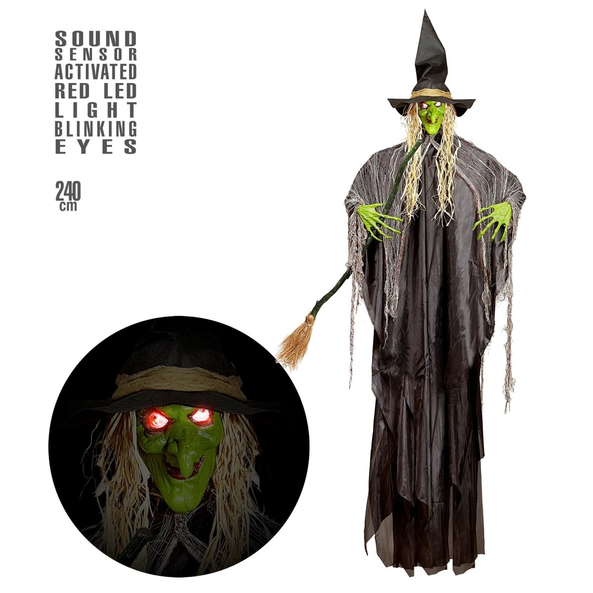 Ge dina halloweendekorationer en kuslig och ikonisk touch med denna 2,4 meter långa Halloween-dockhäxa med ljus och ljud. Perfekt för en läskig atmosfär under Halloween i ditt hem, trädgård eller spökhus.