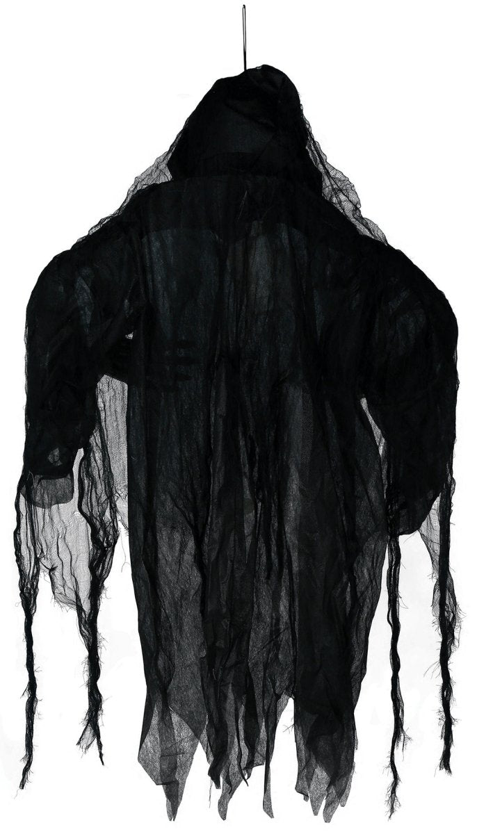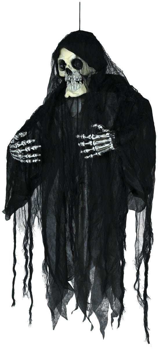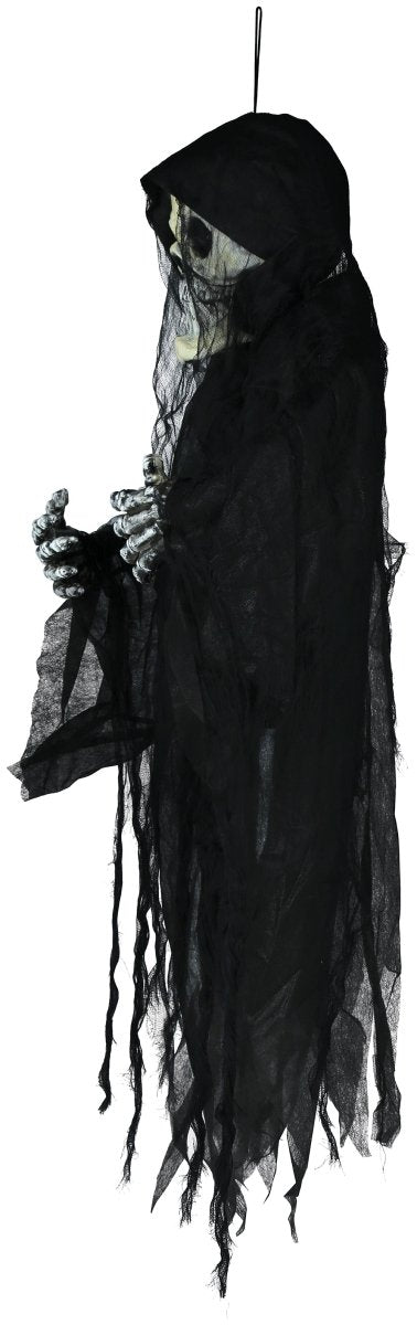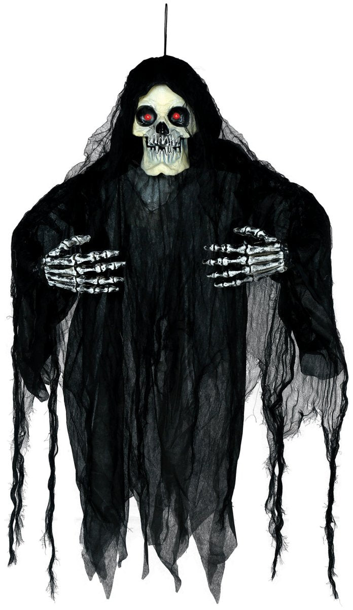 Skapa spänning på din Halloween-fest med detta hängande skelett på 1,20 m. Tack vare ljus-, ljud- och rörelseeffekterna skapar du omedelbart en skrämmande och verklighetstrogen atmosfär.