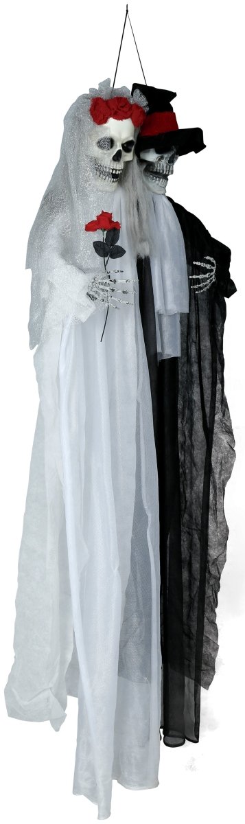 Beskrivning Recensioner Om denna produkt Detta skräckinjagande bröllopspar på 185 cm kommer att fullända din Halloween-fest. Med ljus och ljud skapar dessa hängande skelett en läskig och spöklik atmosfär som kommer att imponera på alla dina gäster. Product features: Innehåll: hängande skelett Mått: 185 cm Material: metall, polyester och PVC Extra: med ljus och ljud Batterier: AA (2 stycken, ingår ej) Trustpilot