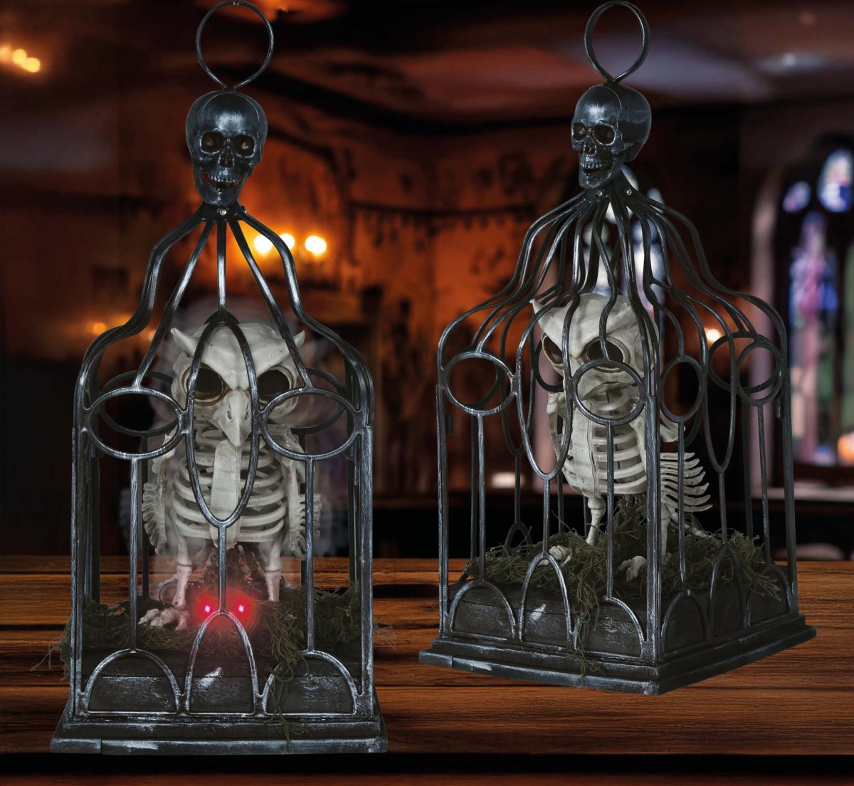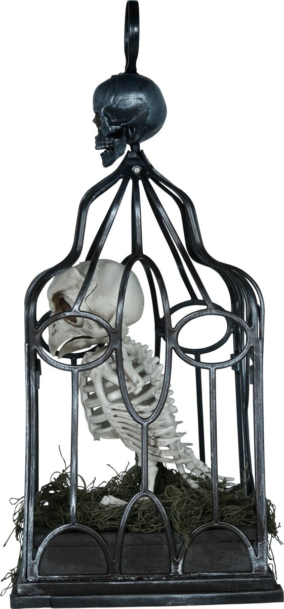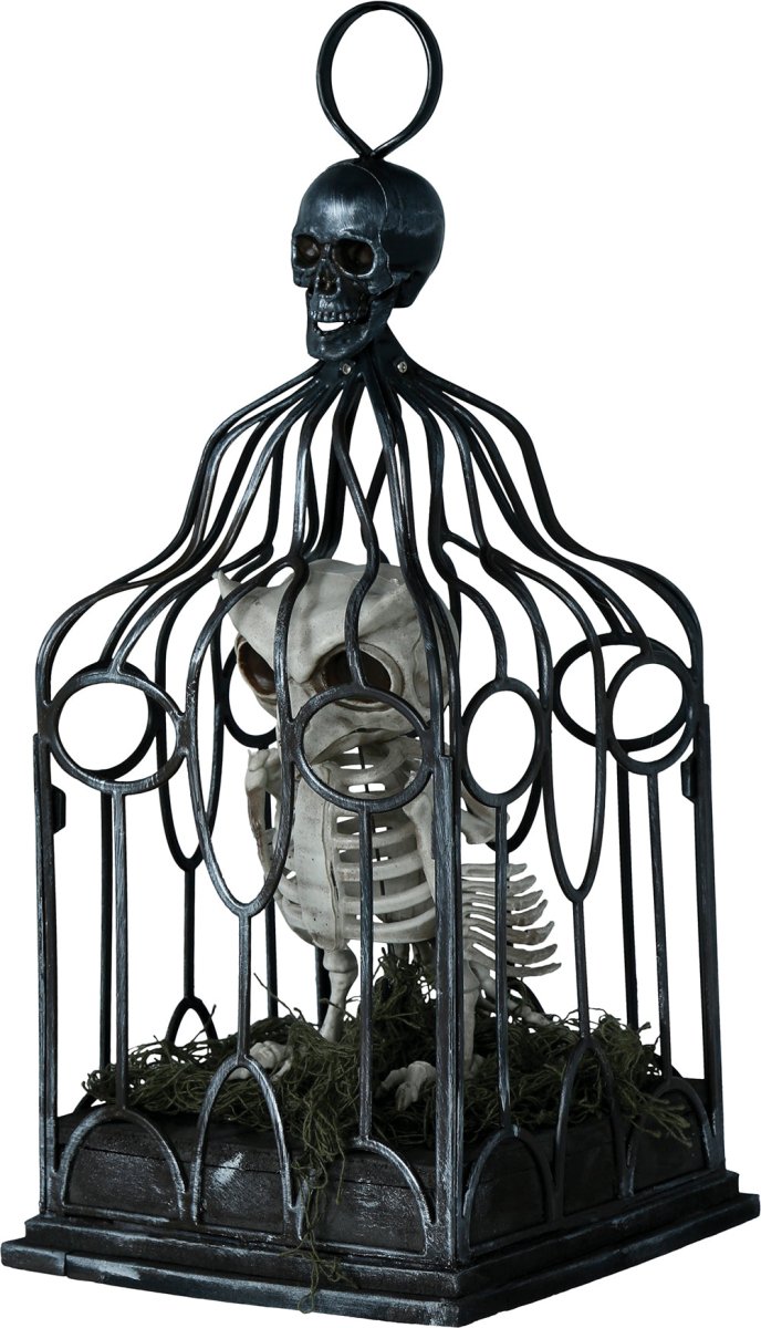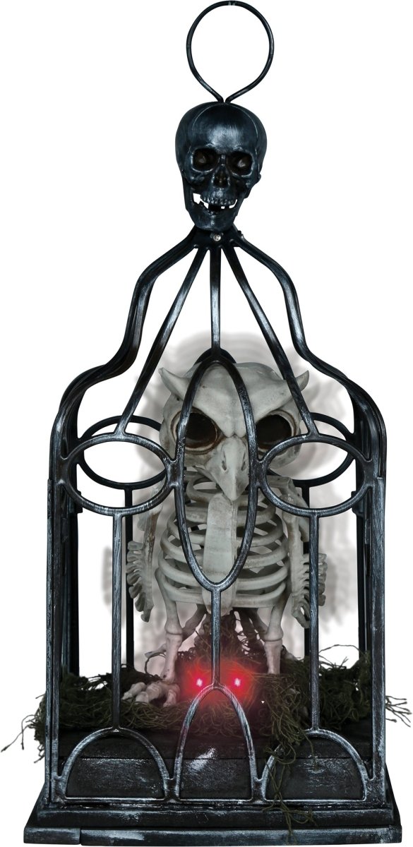 Halloween-skelettuggla i bur med ljus, ljud och rörelse