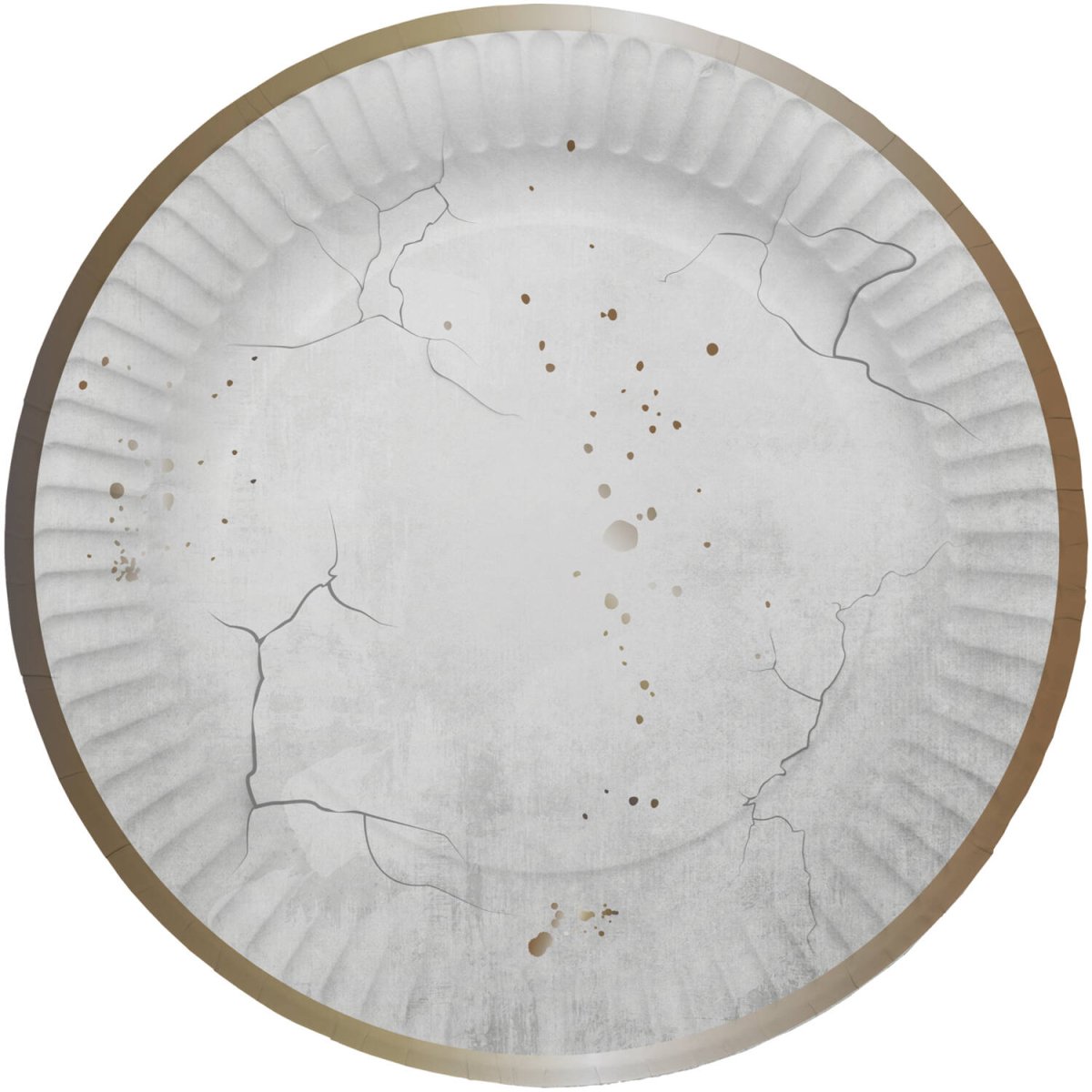 Stylisk mat från en gravsten. Tallrikar - Läskiga kuriositeter - 23 cm - 8 delar. Innehåll: 8 tallrikar. Kan t.ex. användas under följande fest/festtillfällen: Halloween, Temafest. Papperstallrikar med motiv av grå sten med guldglänsande kant och detaljer. Så att du fortfarande kan äta med stil under den hemska Halloweenfesten. Tallrikarna har en diameter på 23 cm och är förpackade per 8 stycken. Denna artikel är tillverkad av FSC-papper.