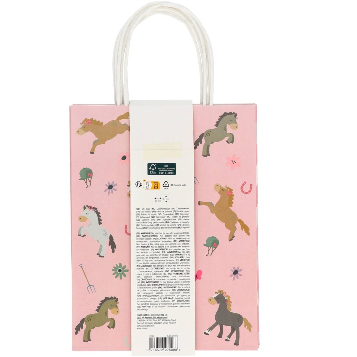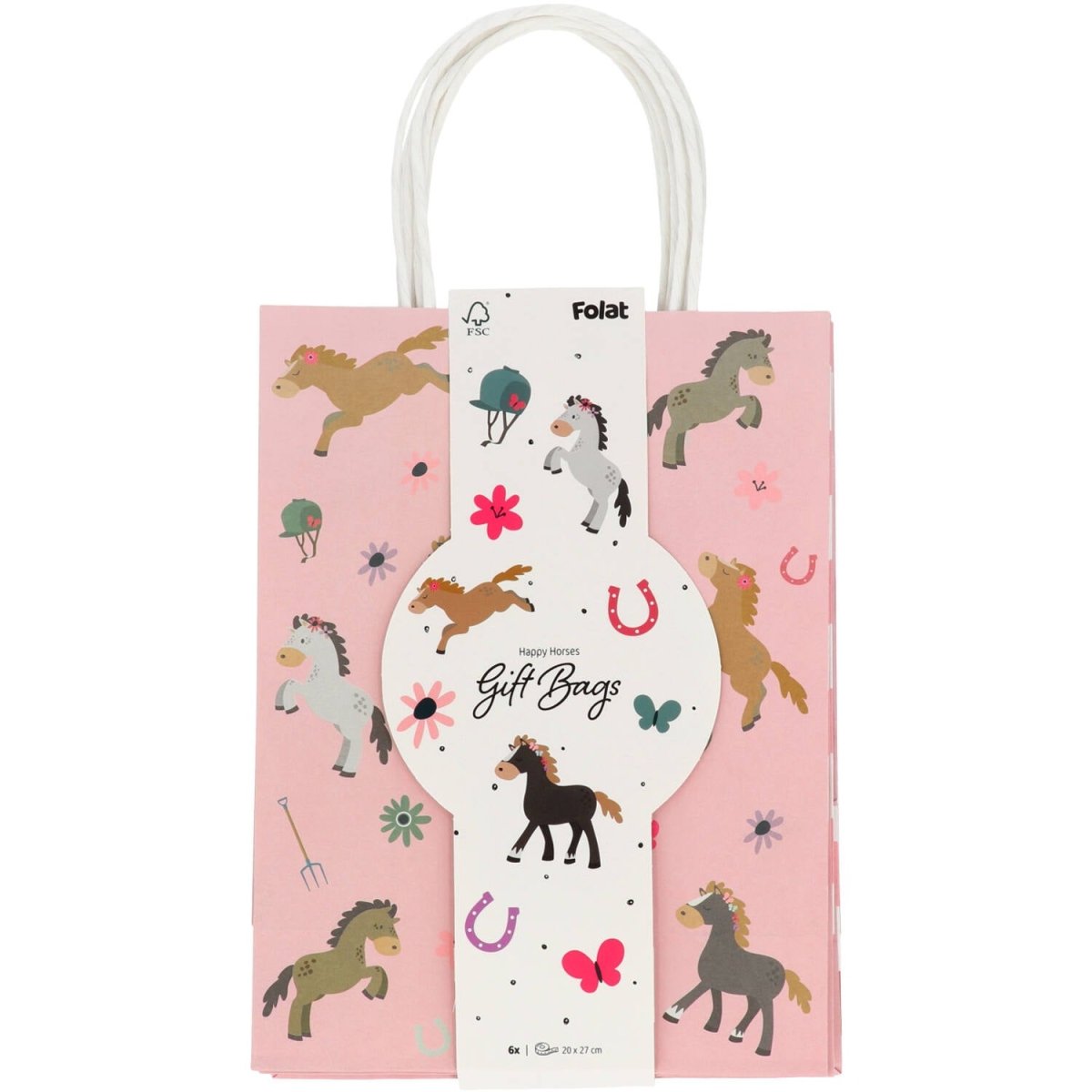 Varje hästfantast vill ha en sådan här väska! Presentpåsar - Happy Horses - 20 x 27 cm - 6 st. Innehåll: 6 st presentpåsar. Kan t.ex. användas vid följande kalas/festtillfällen: Barnkalas, Födelsedag, Temakalas. Glada presentpåsar med måtten 20 x 27 x 10 cm. Mjukt rosa tryck med glada hästar och allt som hör dem till. Påsarnas sidor har ett rutmönster med ljusrosa, grågröna och mörkrosa rutor mot en vit bakgrund. Inklusive handtag är påsarna ca 37 cm hoog.Deze presentpåsar tillhör kollektionen Happy Horses från
