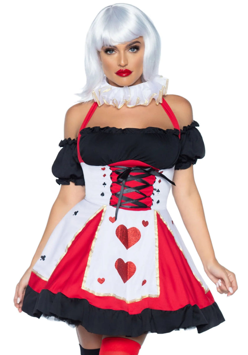 Blanda korten och gå in i Wonderland med 2-delad Pretty Playing Card Costume av Leg Avenue! Denna sexiga underlandsdräkt innehåller en klänning med spelkortdesign med en korsettmidja och en lekfull ruffad krage. Kombinera med accessoarer för att skapa din egen unika look! 🃏✨