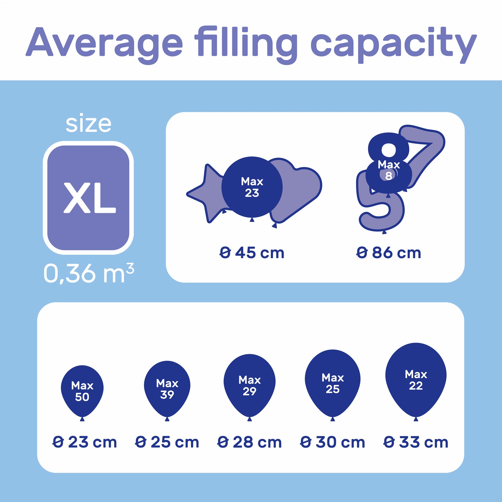 Varje centimeter större en ballong är påverkar dess kapacitet. Heliumtankarna är baserade på ballonger på 25 cm, om man till exempel använder ballonger på 30 cm kan man bara få ut halva mängden ur heliumtanken.