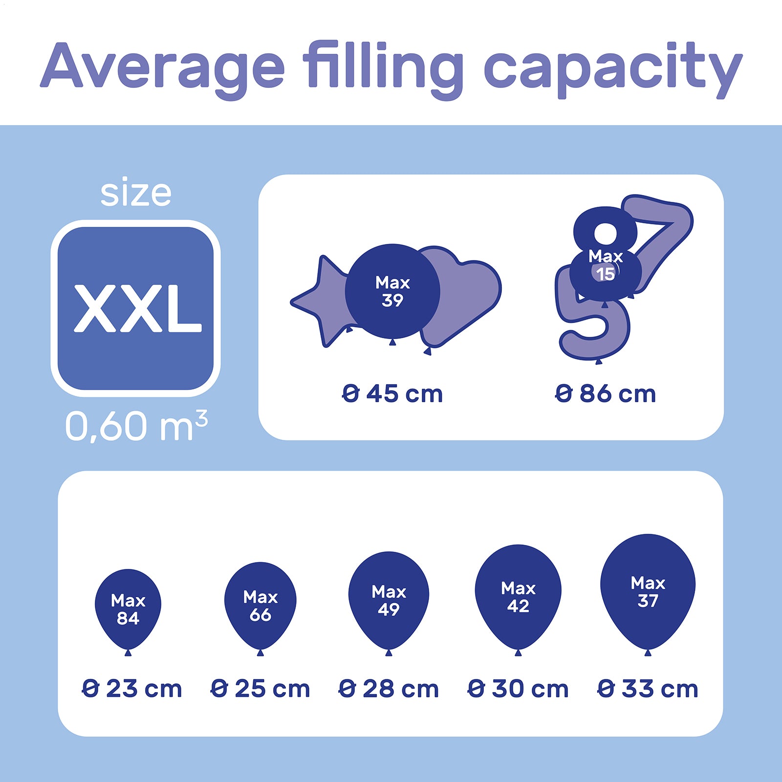 Varje centimeter som en ballong är större påverkar dess kapacitet. Heliumtankarna är baserade på ballonger på 25 cm, om du till exempel använder ballonger på 30 cm kan du bara få ut hälften så mycket ur heliumtanken.