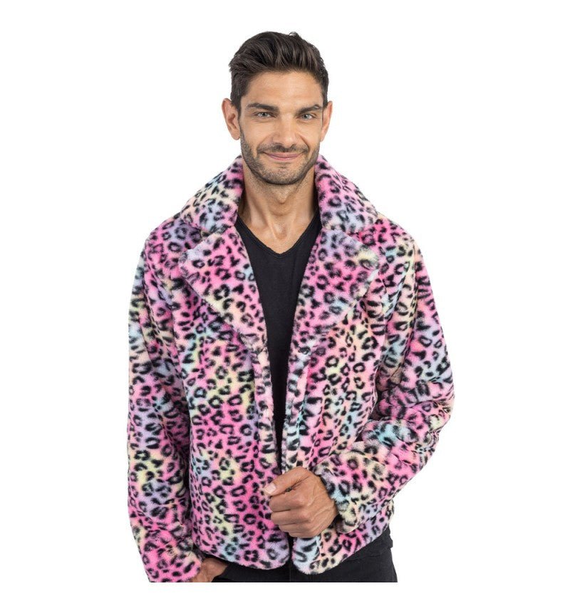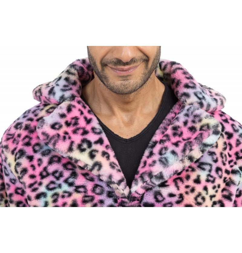 En slående herrkappa som kombinerar komfort och stil med ett livfullt mångfärgat leopardmönster för en djärv och unik look.