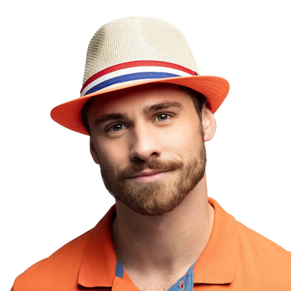 Den här söta Holland-halmhatten ger en lekfull och festlig touch till en outfit för kungadagen, EM eller VM! Hattens band pryds av den holländska flaggan och brättet har en glad orange färg. En accessoar för att visa den holländska stoltheten!