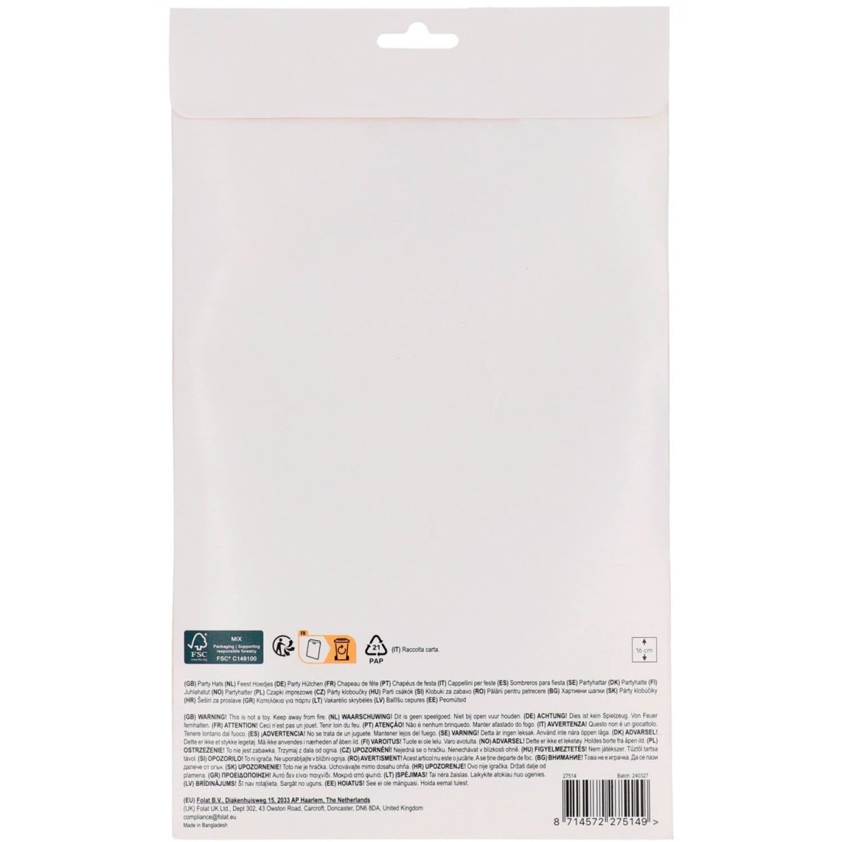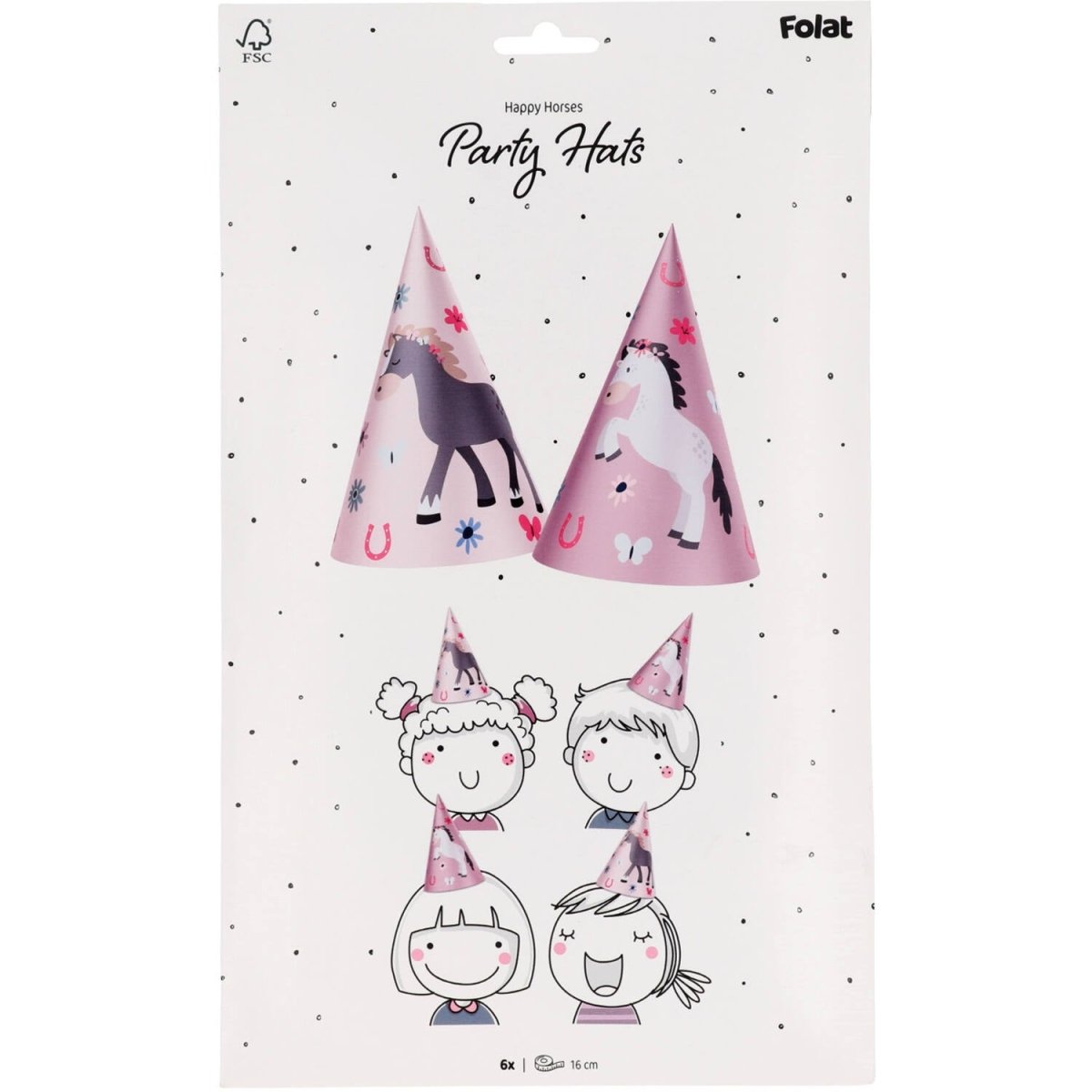 Hästar firar också! Partyhattar - Glada hästar - 6 stycken. Innehåll: 6 partyhattar. Kan t.ex. användas vid följande kalas/festtillfällen: Barnkalas, Födelsedag, Temakalas. Dessa glada partyhattar är 16 cm höga. Det finns två motiv: ett med en vit häst mot en lila bakgrund och ett med en grå häst mot en mjukt rosa bakgrund. Hattarna är platt packade och kan enkelt vikas ihop till en hatt. Gummibanden gör att hattarna sitter säkert på huvudet. Den här artikeln är tillverkad av papper.