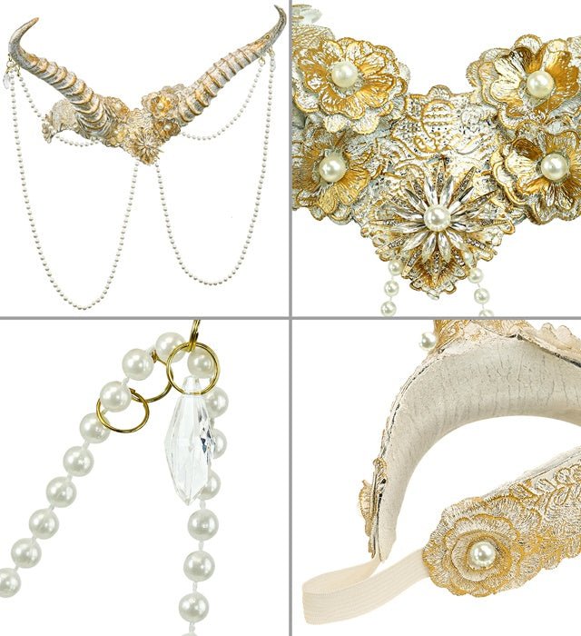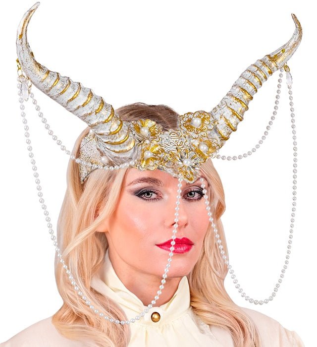 Denna eleganta huvudbonad med horn i vitt och guld är en iögonfallande accessoar för Karnival, Halloween eller en fantasi och temafest. Pärlhalsbanden ger en lyxig och mystisk look.