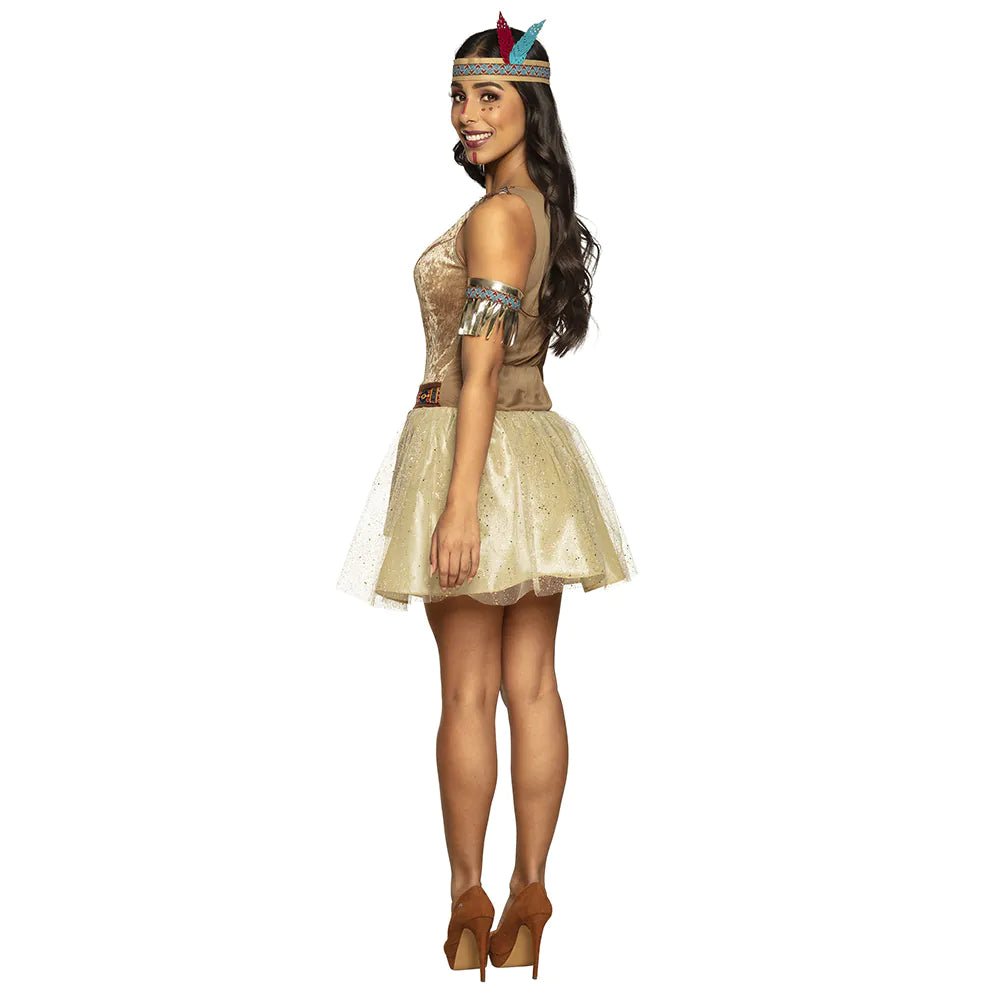 Denna vackra Bright Hawk vuxendräkt är den perfekta dräkten för alla kvinnor som vill klä ut sig under karnevalen eller på maskeraden men som vill se snygga ut. Denna vackra lekfulla dräkt består av en vacker kort klänning gjord av mjukt tyg med en tyllkjol och ett brunt höftskynke dekorerat med inhemska motiv, ett guldfärgat armband med fransar och för att fullända dräkten ett pannband med fjädrar.