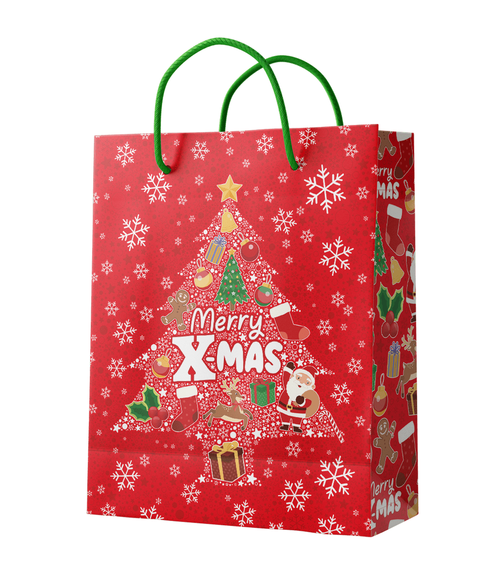 Slå in dina julklappar stilfullt med denna stora presentpåse i rött med festliga julmotiv, såsom renar, snöflingor och texten Merry Christmas. Den glada designen gör väskan till ett riktigt blickfång under julgranen.