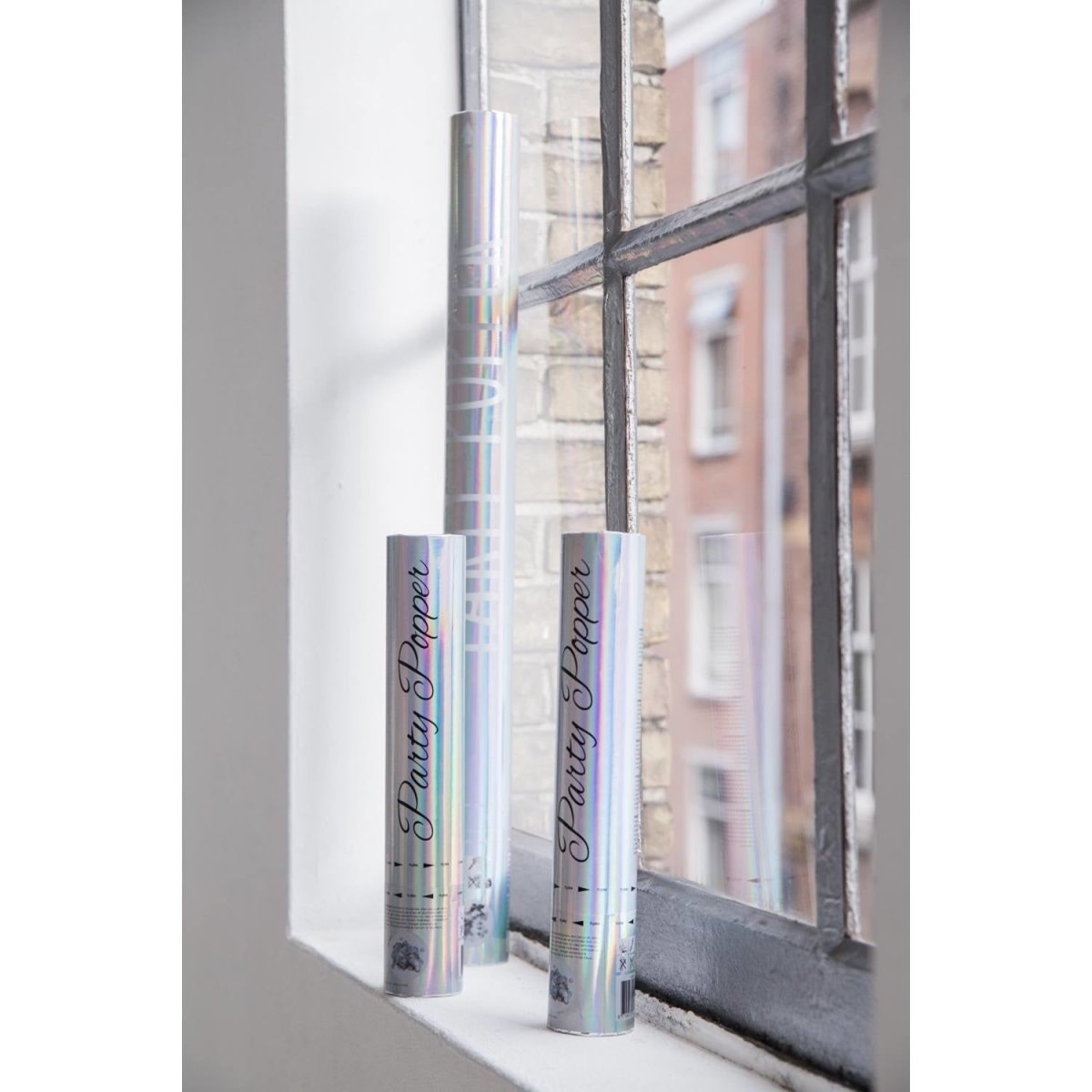 Konfettikanon Silver - 28cm. Innehåll: 1 konfettikanon. Färg: Silver. Kan t.ex. användas vid följande fest-/partytillfällen: födelsedag, barnkalas och jubileum. Artikeln är 28 cm lång. Artikeln är tillverkad av plast.