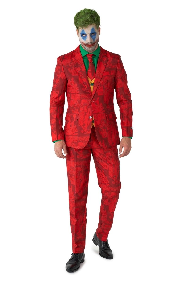 Om det finns någon skurk som kan konkurrera med Batman så är det Jokern. När allt kommer omkring vet vi alla hur långt han skulle gå för att få dig att le. Den här röda dräkten påminner om Jokern och kommer med ikonisk serietidningskonst och en gul väst för att fullända looken. Vill du bli Clown Prince of Crime? Med den här officiella The Joker™-dräkten får du jobbet gjort med lätthet. Kostymen med smal passform innehåller kavaj, väst, byxor och slips. Byxorna har ett justerbart midjeband för perfekt passform.