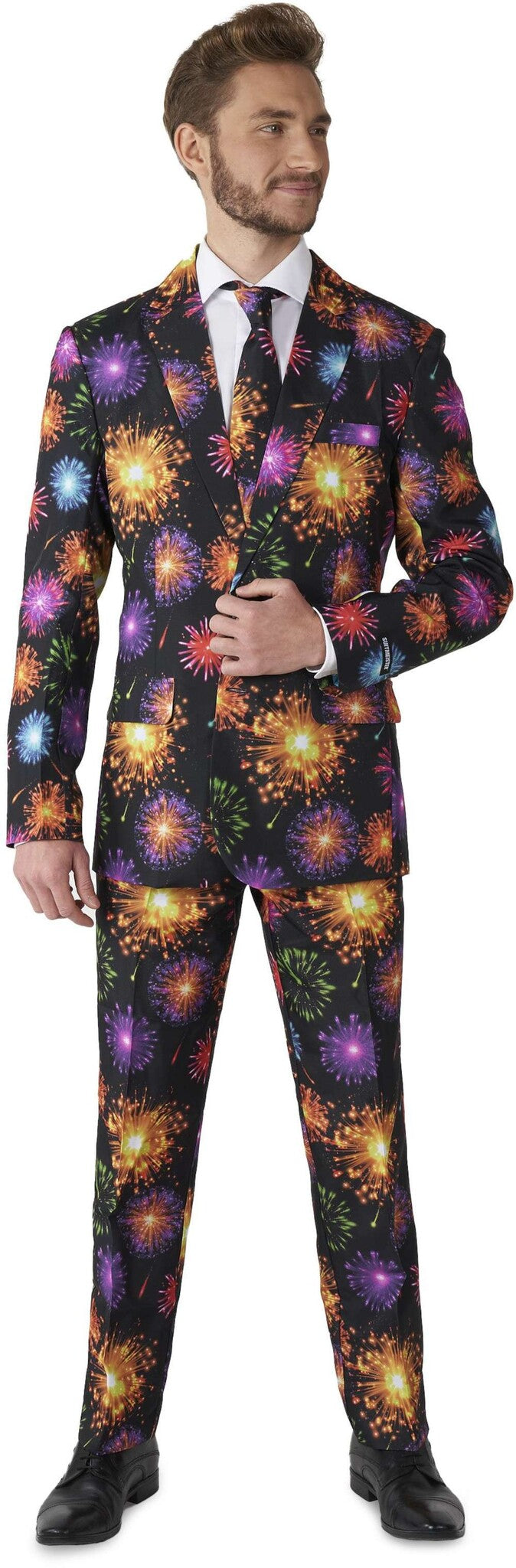 När fyrverkerierna börjar lysa vet du att du har en toppenfest på gång. Så varför inte göra dig redo för tillfället med denna flammande kostym? Gör varje dag till en fest på NYE eller den 4 juli genom att bära den ultimata fyrverkeridräkten.... BANG! Den slimmade dräkten består av kavaj, byxor och slips. Byxorna har ett justerbart midjeband för perfekt passform.