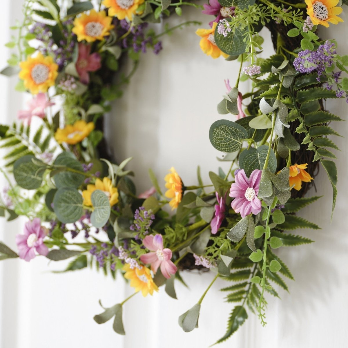 Den här dekorativa vårkransen har små gula och rosa prästkragar, lavendel och en fin touch av ormbunkar, murgröna och salviagröna blad.
