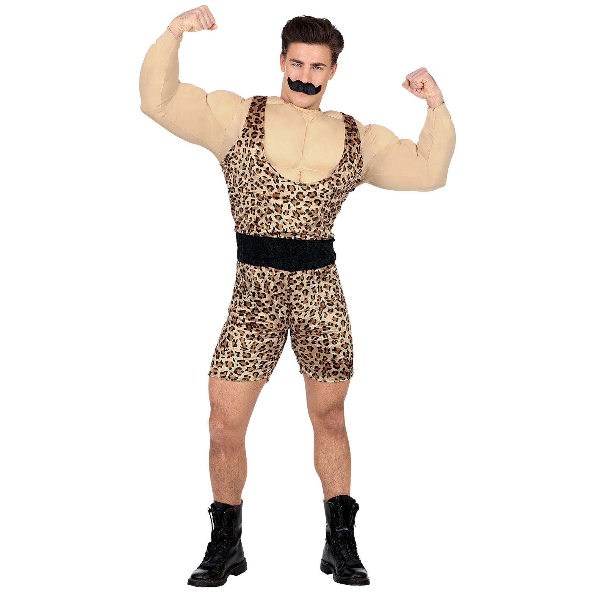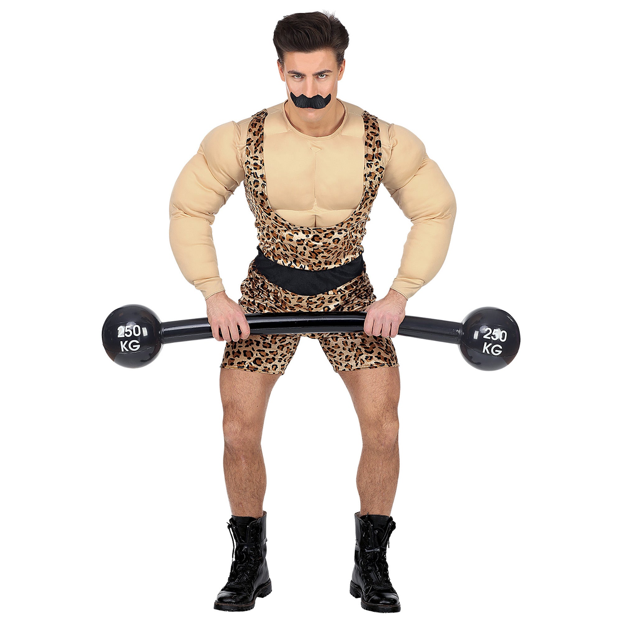 Beskrivning: stark man overall med muskulös skjorta och bälte, mustasch