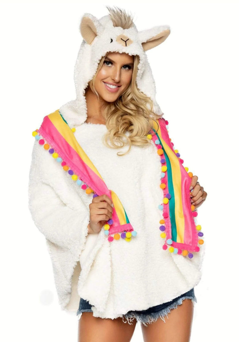 Bring en touch av söthet till alla fester med Llama Poncho Costume från Leg Avenue! Denna mysiga och lekfulla ensemble inkluderar en plyschzIGe vit poncho med en bedårande lama ansiktshuva, glada pompom tofsar och en plyschzIGe svans. Den lösa passformen och det mjuka fleecetyget gör den här dräkten extra bekväm, perfekt för en avslappnad och lekfull look på vilken fest som helst! 🎉💖