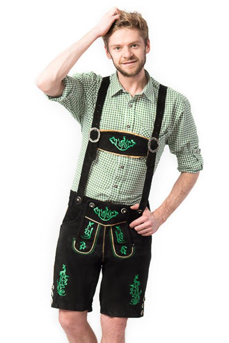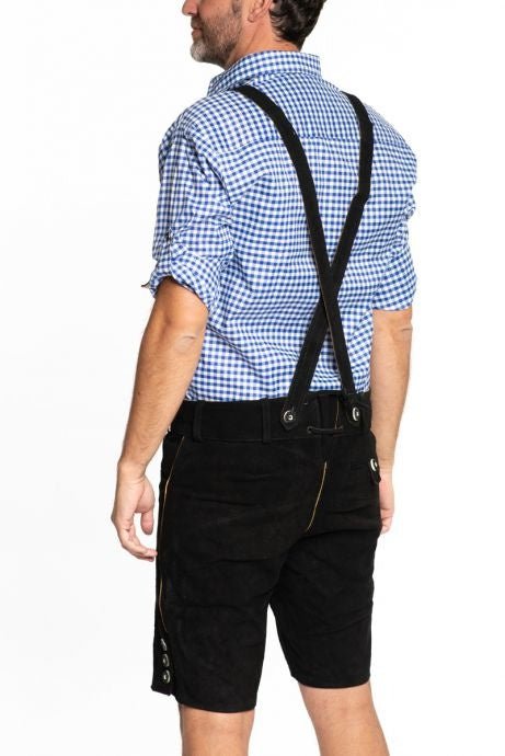 Lederhose Läder Kort Svart Stitched och Hängslen