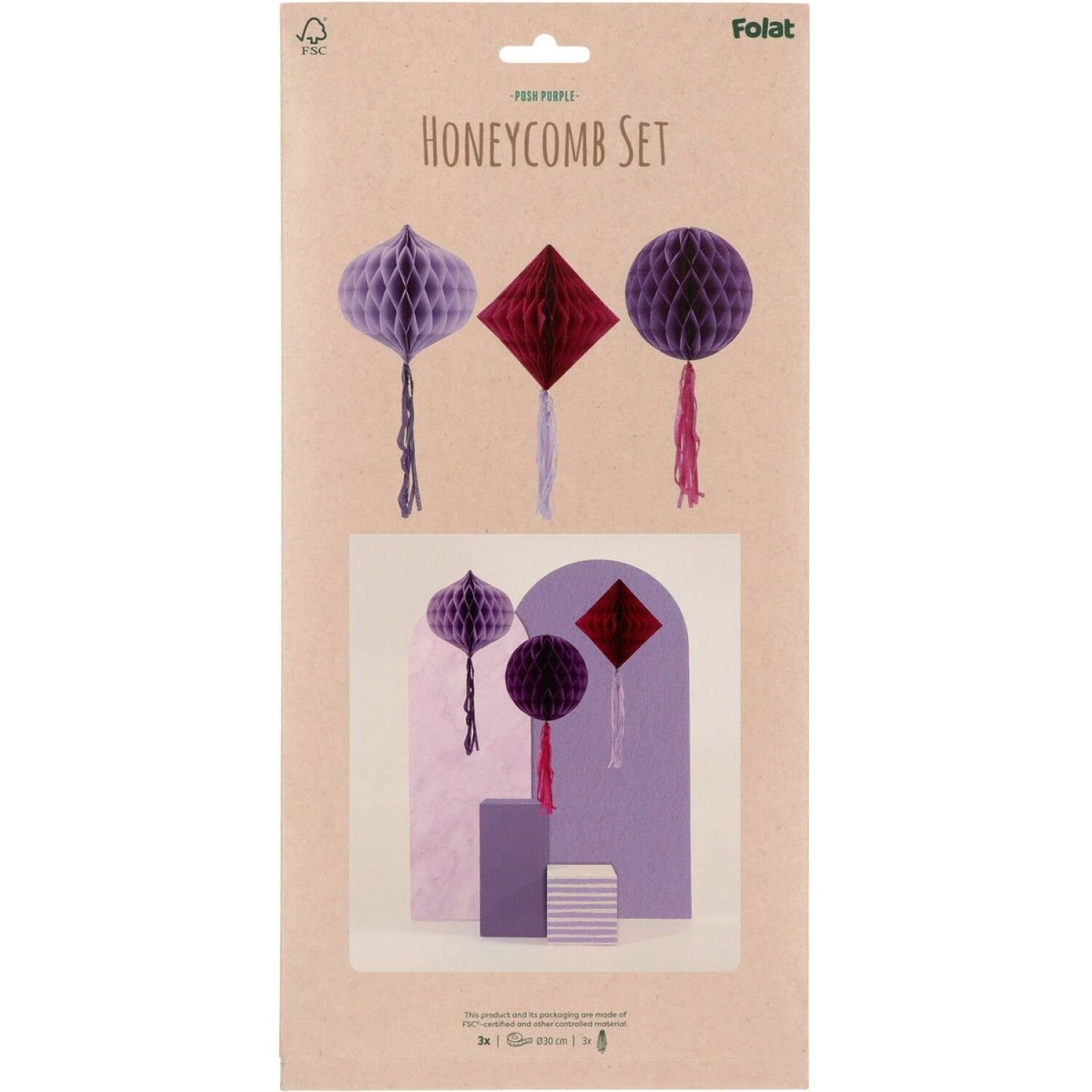 En stilig klassiker i 'posh purple'. Honeycombs - Posh Purple - 3 stycken. Innehåll: 3 dekorativa solfjädrar. Kan t.ex. användas under följande fest/festtillfällen: Födelsedag, Temafest. Vackra, kraftiga bikakor i tre nyanser av lila. I formerna: diamant, rund (med 30 cm diameter) och oval (storlek 25 x 30 cm). Från varje bikaka hänger en 25 cm lång tofs av papper i en kontrasterande lila nyans. Bikakorna är förpackade vikta och kan enkelt vikas ut före användning. Dekorationen kan enkelt hängas upp i bomullssnöret. Med gem för att hålla fläktarna i rund form. Denna artikel är tillverkad av FSC-papper.