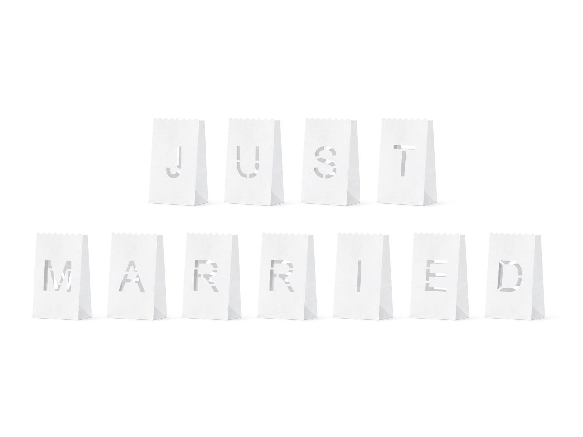 Innehåll: Ljuspåsar Ljuspåsar, set innehåller 11 st lyktor med utskurna bokstäver som skapar inskriptionen Just Married. Storlek efter utfällning ca 11,5 x 19 x 7 cm. Produkten är tillverkad av icke brännbart papper.(1 pkt/11 pct.)