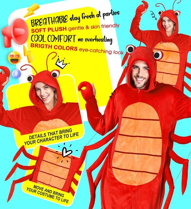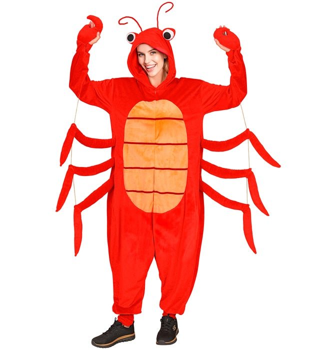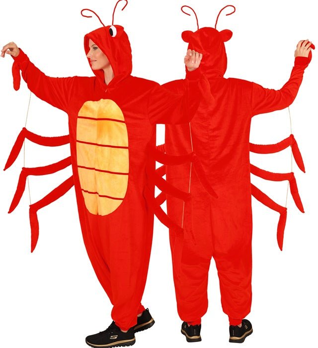 Denna jumpsuit i hummerplymf med huva och mask är en komplett dräkt för temafester eller cosplay.