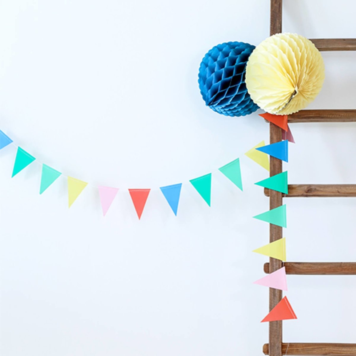 Mini Flagline Retro Multicolour - 2,6 meter. Innehåll: 1 minigirlang. Färg: Mångfärgad. Kan t.ex. användas under följande fest/festtillfällen: Födelsedag, Barnkalas och Jubileum. Denna girlang är 2,6 meter lång, varav 2 meter med flaggor. Den innehåller 24 flaggor som mäter 7x8 cm. Artikeln är tillverkad av papper.