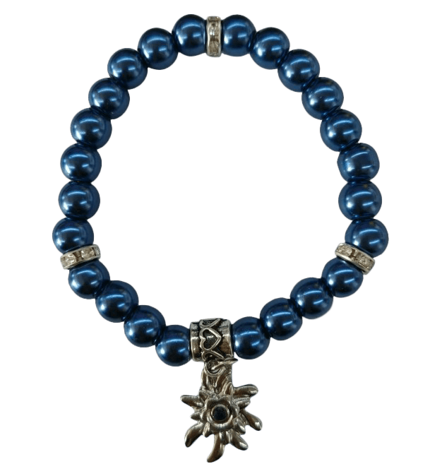 Lägg till en elegant touch till varje outfit med detta mörkblå armband med pärlor och edelweiss. Den eleganta designen gör armbandet lämpligt för vardagsbruk eller som en speciell gåva.