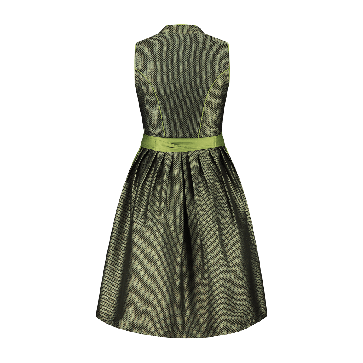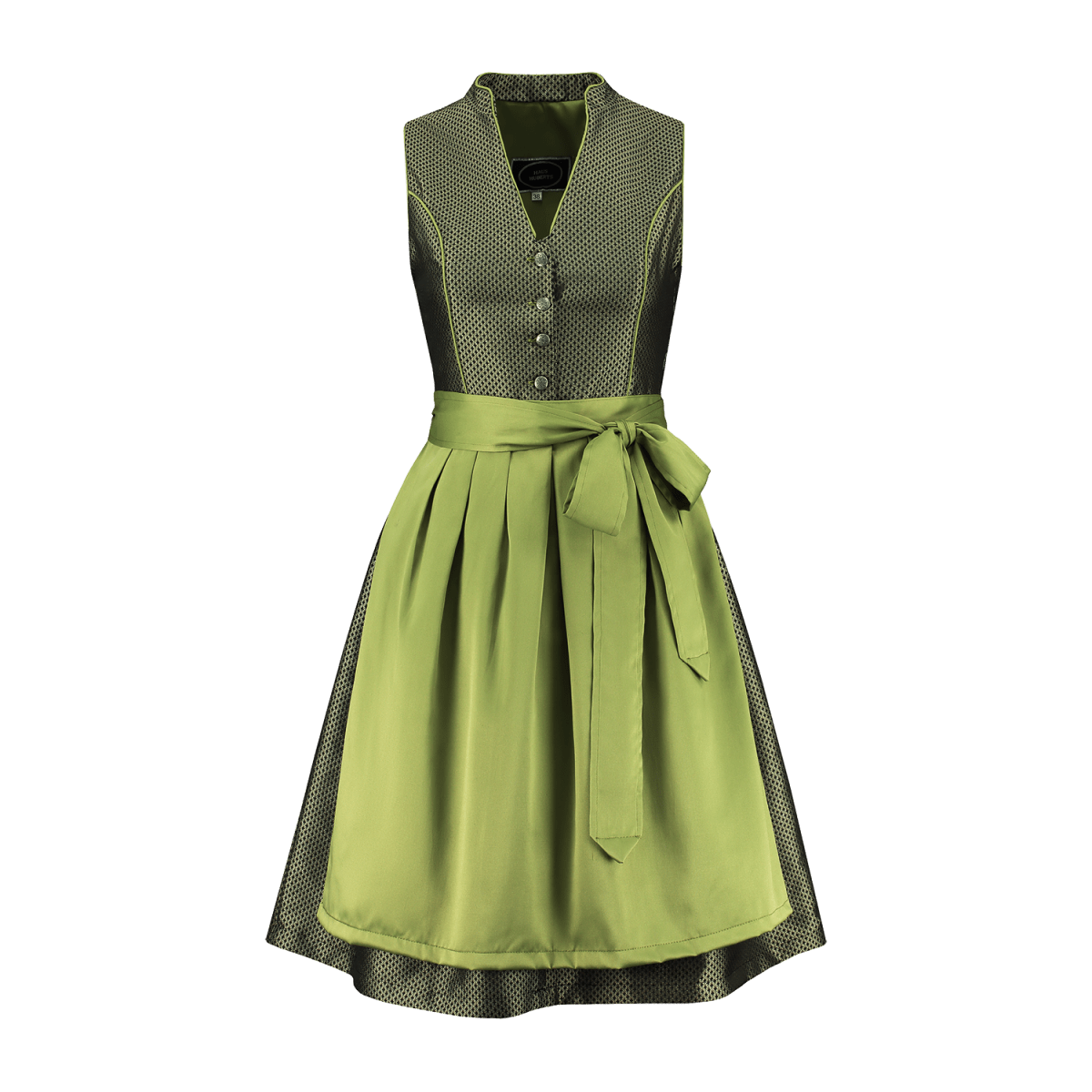 Snygg 2-delad retro-dirndl i fint jacquardtyg med vackert vävt mönster. Grön, med ett snyggt bomullsförkläde. Dirndl-modellen har en imponerande halsringning, med kort ståkrage och knappstängning mitt fram med YKK-blixtlås. Med antika silverknappar (blommönster). Kjol med elegant boxveck. En slip pocket i kjolen. Kjolens längd: ca 60 cm. Finns i storlekarna 36 till 52.