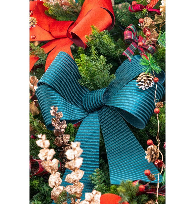 Denna medelstora dekorativa rosett är idealisk för utsmyckning av presenter, festdekorationer eller säsongsdekorationer. Tack vare det robusta materialet håller rosetten formen och är lämplig att återanvända.