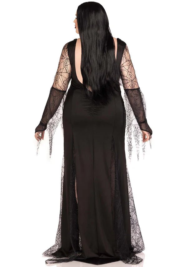 Låt din mystiska sida lysa i den förtrollande Sexy Morticia-dräkten! Denna lockande ensemble innehåller en fantastisk klänning med glittrande paljetter, en slående ruffad rygg, läckra spindelvävsärmar och en dramatisk tentakelkjol med hög slits. Perfekt för en oförglömlig Halloween-look som kommer att lämna ett spöklikt och glamoröst intryck! 🕷️🌙